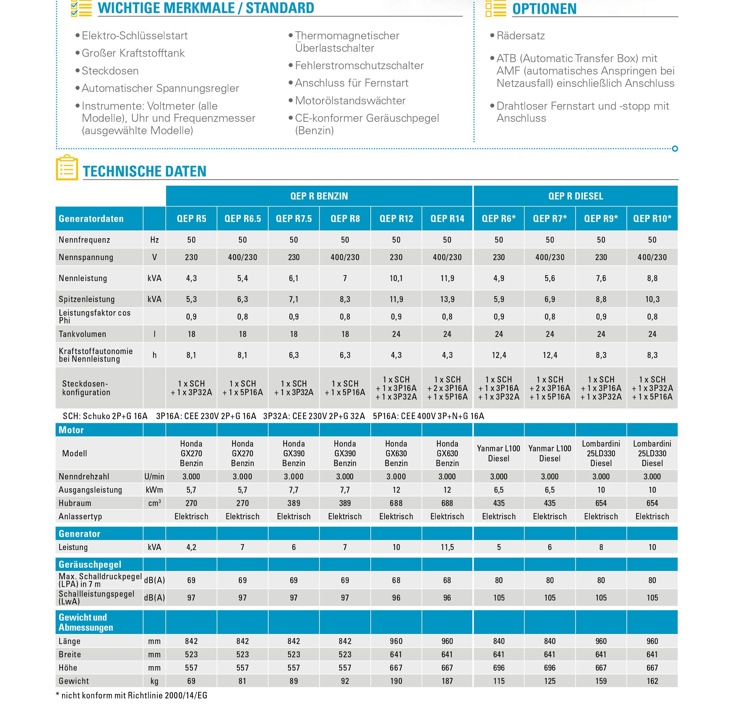Der QEP R verfügt über Funktionen für automatischen und Fernstart, bietet zuverlässige Leistung und ist auch nach längeren Ruhezeiten sofort wieder einsatzbereit. Das Risiko eines Generatorschadens durch Fehlbedienung oder Überlastung wird durch den internen Fehlerstromschutzschalter minimiert.